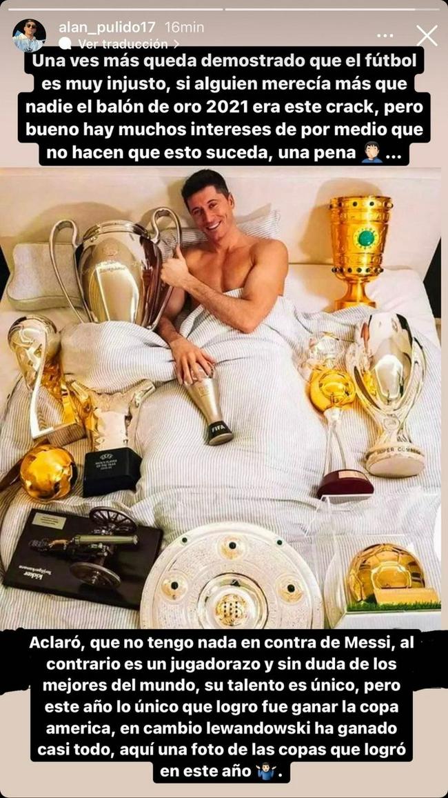“说明一下,我没有反对梅西。相反,他是一个伟大的球员,无疑是世界上最好的球员之一。他的天赋是独一无二的,但今年,他唯一的成就是赢得了美洲杯。另一方面,莱万多夫斯基几乎赢得了一切。这是他今年赢得的奖杯的照片。”