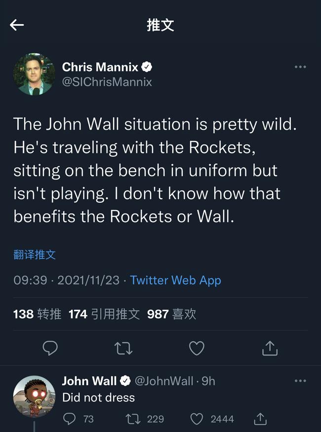 北京时间11月23日,今天火箭队客场输球的比赛结束之后,《体育画报》记者克里斯-曼尼克斯在社交媒体上表达了他的疑惑。而当火箭队球员约翰-沃尔看到这则消息之后,在评论区进行了回复。