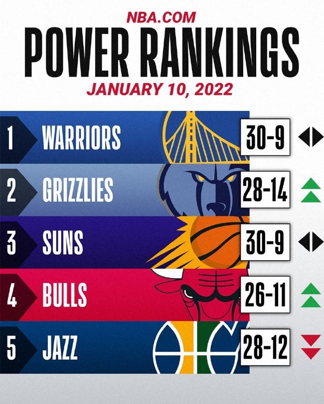 北京时间1月11日,NBA官方公布了最新一期实力榜排名,勇士仍居榜首,灰熊飙升至二,篮网跌至第八,湖人仍排在第17。