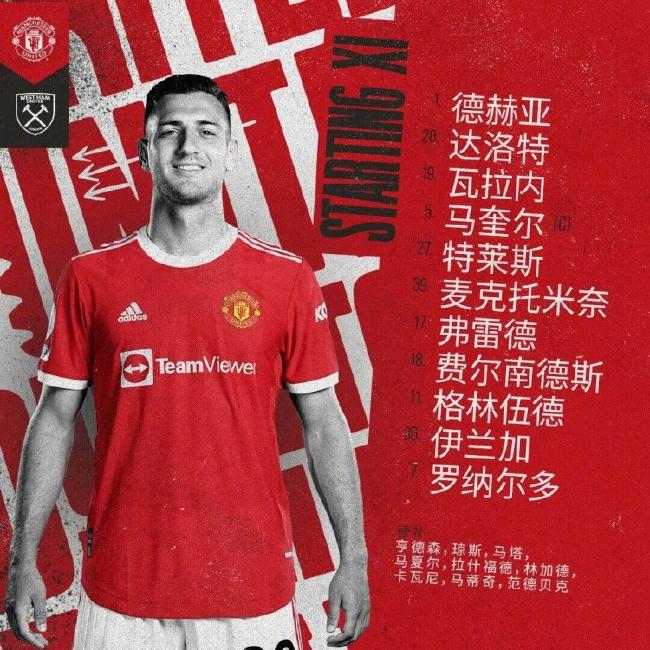 曼联首发:1-德赫亚、5-马奎尔、27-特莱斯、19-瓦拉内、20-达洛特、39-麦克托米奈、17-弗雷德、18-布鲁诺-费尔南德斯、11-格林伍德、37-埃兰加、7-C罗