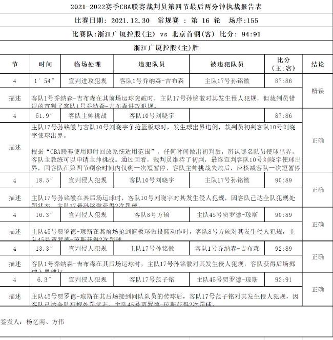 北京时间12月31日消息,CBA官方公布了常规赛第16轮,北京91-94广厦的裁判报告。